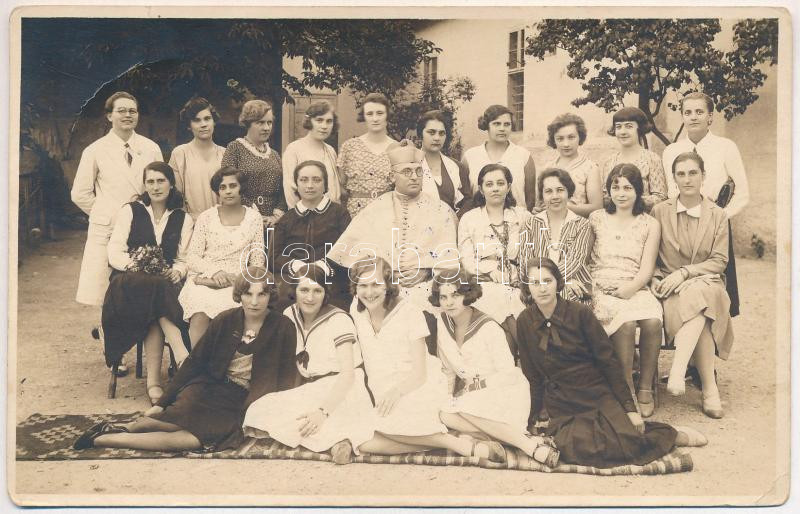 Leírás: Torda, Turda; Lány növendékek csoportképe pappal a templom előtt / Girls with priest in front of the church. Fotograf Csiky A. photo (EB)