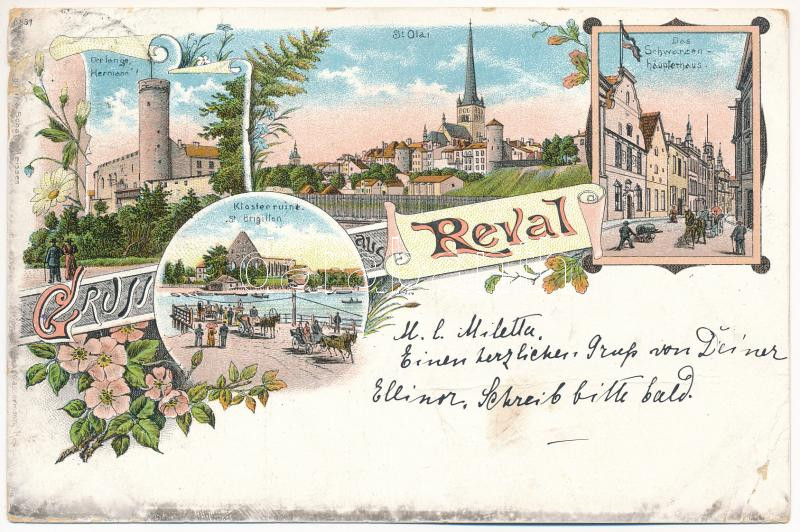1897 (Vorläufer) Tallin, Reval; Der lange Hermann, St. Olai, Das Schwarzenhäupferhaus, Klosterruint St. Brigitten / Tall Hermann, St. Olaf church, House of the Blackheads, Bridgettine monastery ruins. Wassermann Art Nouveau, floral, litho (szakadások / tears)