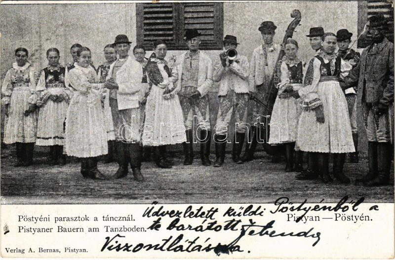 1900 Pöstyén, Piestany; Pöstyéni parasztok a táncnál, zenekar. A. Bern... https://www.darabanth.com/hu/457-Gyorsarveres/457.0/Kepeslapok/Felvidek~1000007/1900-Postyen-Piestany-Postyeni-parasztok-a-tancnal-zenekar-A-Bernas-kiadasa-Pistyaner-B~II3054029