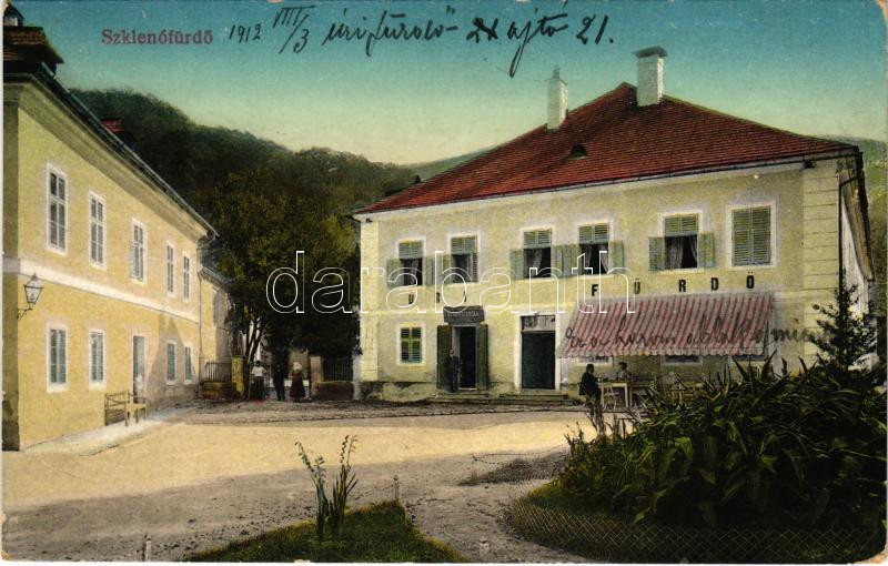 Leírás: 1912 Szklenófürdő, Sklené Teplice; Úri fürdő, gyógyszertár / spa, bath, pharmacy (EK)