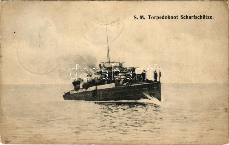 Leírás: 1909 SMS Scharfschütze osztrák-magyar Huszár-osztályú romboló / K.u.K. Kriegsmarine S.M. Torpedoboot Scharfschütze / Austro-HUngarian Navy destroyer. G. Fano Pola 1908-09. 22. (fl)
