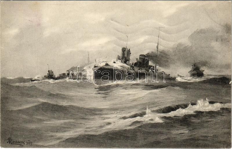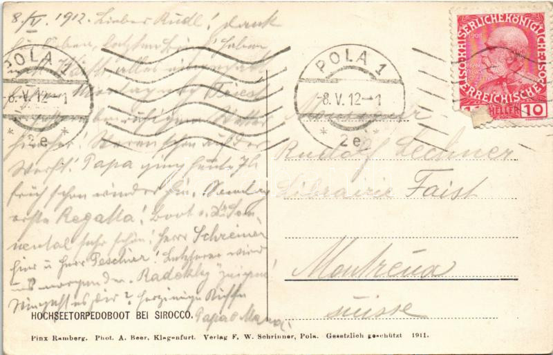 Leírás: 1912 K.u.K. Kriegsmarine Hochseetorpedoboot bei Sirocco. Phot. A. Beer, F.W. Schrinner Pola 1911 s: Ramberg