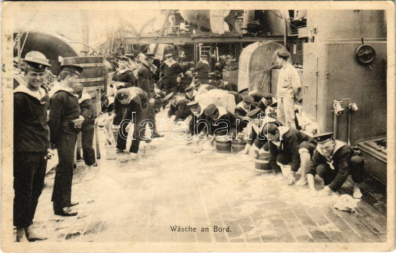 1912 K.u.K. Kriegsmarine Matrosen, Wasche am Bord / Osztrák-magyar matrózok fedélzet mosás közben / Austro-Hungarian Navy mariners cleaning the deck. F.W. Schrinner Pola 1912.