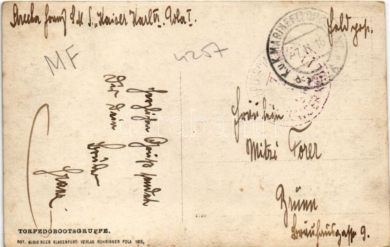Leírás: 1916 SMS RÉKA, a K.u.K. haditengerészet Huszár-osztályú rombolója, matrózok munkában / K.u.K. Kriegsmarine Torpedobootsgruppe, Matrosen / Austro-Hungarian Navy mariners of SMS Reka. Fot. Alois Beer 1915. + "K.u.k. Marinefeldpostamt" (EK)