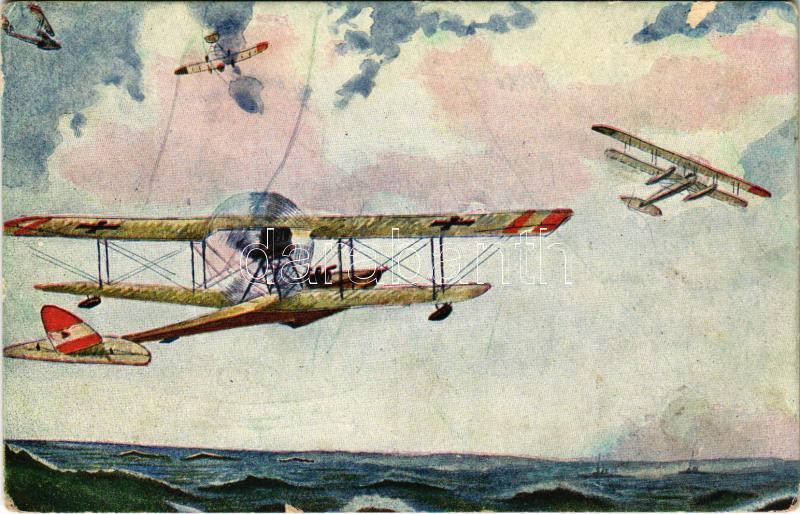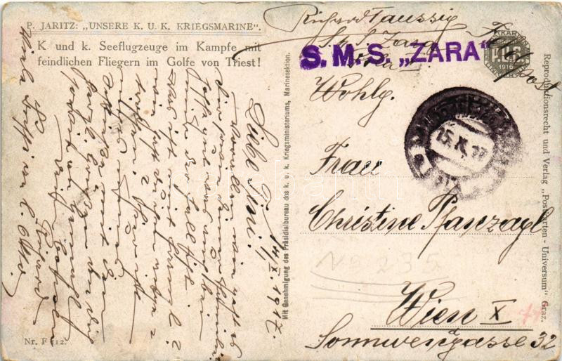 1917 K. und k. Seeflugzeuge im Kampfe mit feindlichen Fliegern im Golfe von Triest! Unsere K.u.K. Kriegsmarine P.U.G. Nr. F. 112. / Austro-Hungarian navy postacard, seaplane, hydroplane s: P. Jaritz (EK) + "S.M.S. "ZARA"