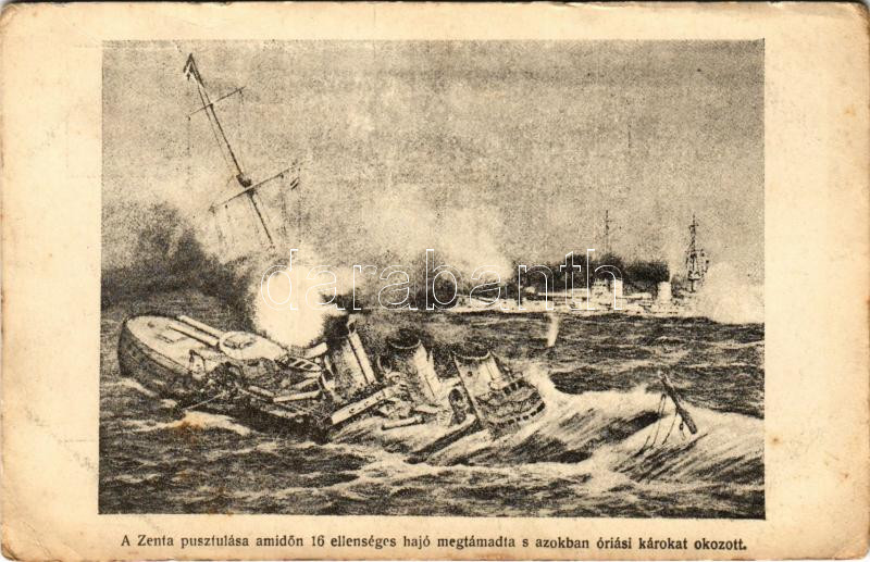 A Zenta pusztulása, amidőn 16 ellenséges hajó megtámadta, s azokban óriási károkat okozott. Gringlinger J. kiadása / K.u.K. Kriegsmarine / WWI Austro-Hungarian Navy art postcard, sinking of SMS Zenta armored cruiser (EB)