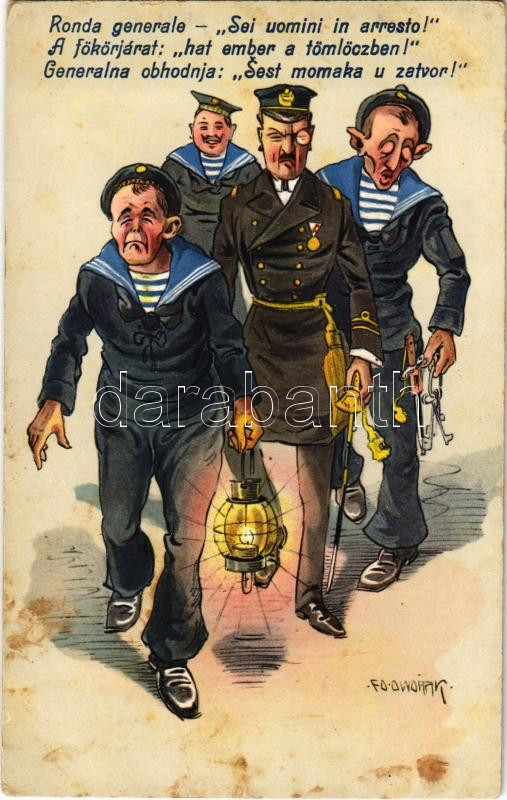 A főkörjárat: hat ember a tömlőcben / Ronda generale Sei uomini in arresto! / Generalna obhodnja: Sest momaka u zatvor / K.u.K. Kriegsmarine Matrosenhumor / Austro-Hungarian mariner humour art postcard. C. Fano 1914/15. 9. s: Ed. Dworak (fl)
