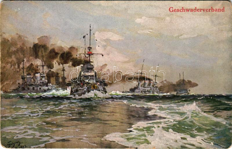 Leírás: Geschwaderverband Kaiserliche Marine. Wohlgemuth & Lissner Primus-Postkarte "Unsere Marine" No. 876. / German Navy art s: Hans Bohrdt (fl)