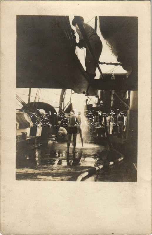 Leírás: K.u.K. Kriegsmarine Matrosen / Osztrák-magyar matrózok zuhanyoznak a fedélzeten / Austro-Hungarian Navy mariners taking a shower on deck. F.W. Schrinner 1918.