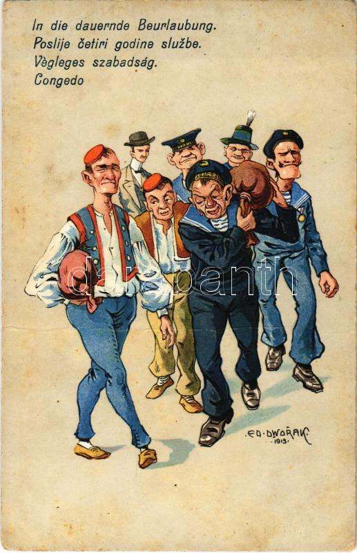 Végleges szabadság / Poslije cetiri godine sluzbe / Congedo / In die dauernde Beurlaubung. K.u.K. Kriegsmarine Matrosenhumor / Austro-Hungarian mariner humour art postcard. C. Fano 1914/15. 33. s: Ed. Dworak (fa)