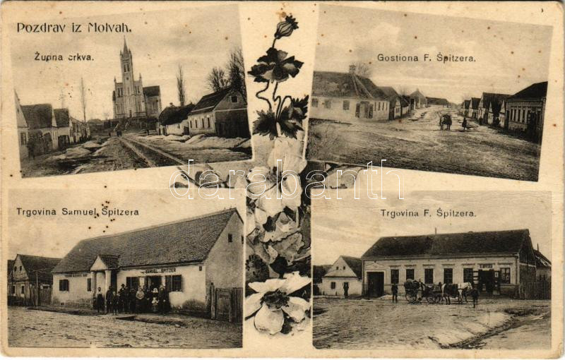 1914 Molna, Molve; Zupina crkva, Gostiona F. Spitzera, Trgovina Samuel Spitzera, Trgovina F. Spitzera / templom, F. Spitzer vendéglője és üzlete, Samuel Spitzer üzlete / church, inn, shops. Floral (fa)