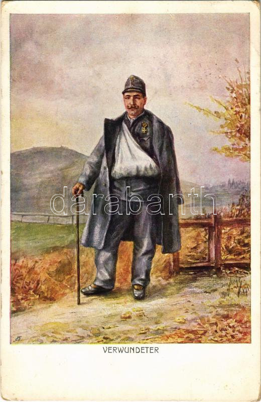 1915 Verwundeter / WWI Austro-Hungarian K.u.K. military art postcard, injured soldier. Offizielle Karte des Kriegshilfsbüros Invaliden-Hilfsaktion Nr. 21-4. artist signed (EK)
