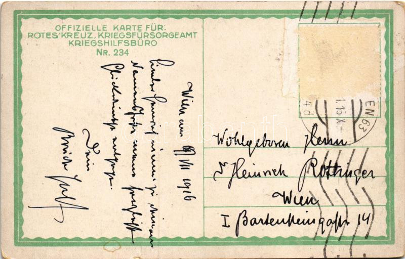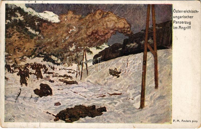1916 Österreichisch-ungarischer Panzerzug im Angriff. Offizielle Karte für Rotes Kreuz, Kriegsfürsorgeamt, Kriegshilfsbüro Nr. 234. / WWI Austro-Hungarian K.u.K. military art postcard, attack of the armored train s: P. M. Anders (Rb)