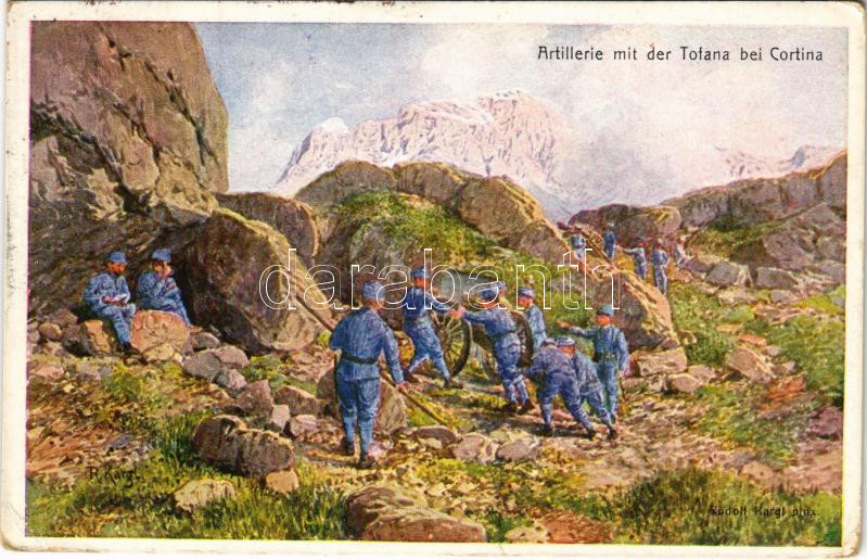 Artillerie mit der Tofana bei Cortina. Offizielle Karte für Rotes Kreuz, Kiregsfürsorgeamt Kriegshilfsbüro Nr. 213. / WWI Austro-Hungarian K.u.K. military art postcard s: Rudolf Kargl (EK)
