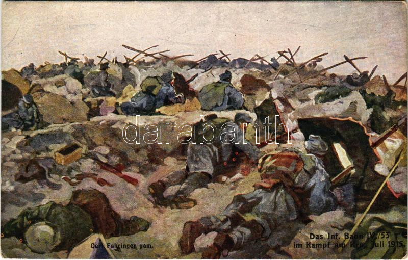 Das Inf. Baon IV./53 im Kampf am Krn, Juli 1915. Offizielle Karte für Rotes Kreuz, Kriegsfürsorgeamt, Kriegshilfsbüro Nr. 565. / WWI Austro-Hungarian K.u.K. military art postcard, support fund s: Carl Fahringer (EK)