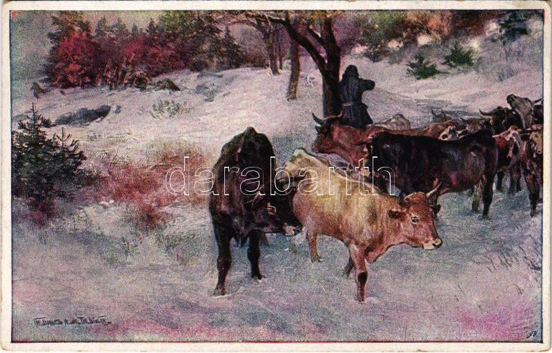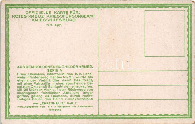 Franz Baumann, Infanterist des K.K. Landwehr-Infanterieregimentes Nr. 21., wurde als ehemaliger Viehhändler damit beauftragt, mit einer Patrouille in einer vom Feinde besetzten Ortschaft Schlachtvieh einzukaufen. Offizielle Karte für Rotes Kreuz, Kreigsfürsorgeamt, Kriegshilfsbüro Nr. 497. Aus dem goldenen Buche der Armee Serie V. Aus "Ehrenhalle" Heft 2 / WWI Austro-Hungarian K.u.K. military art postcard s: Fr. Jung