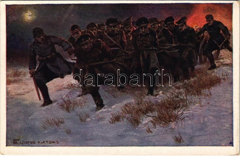 Gefreiter, Titular-Korpolar Eduard Lux, von der 9. Kompagnie des schlesischen Infanterie-Regimentes Nr. 1., treibt mit zwei Kameraden dreizehn gefangene Russen zum eigenen Brigadekommando, nachdem er seine Gefangenen mit Riemenzeug an die Lafetten zweier russischer Maschinengewehre gespannt hatte. Aus dem goldenen Buche der Armee Serie V. Offizielle Karte für Rotes Kreuz. Kriegsfürsorgeamt Kriegshilfsbüro Nr. 551. / WWI Austro-Hungarian K.u.K. military art postcard, support fund, Russian POWs (prisoners of war) s: Fr. Jung