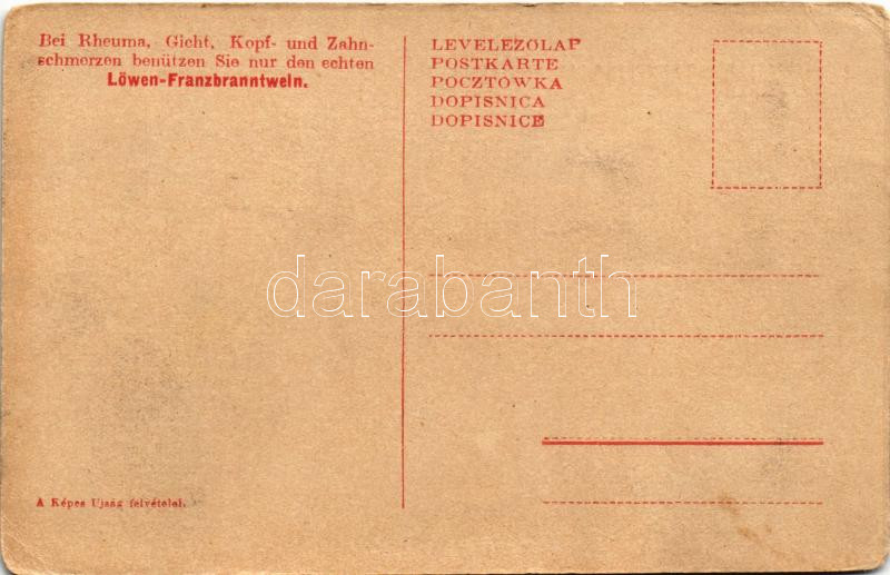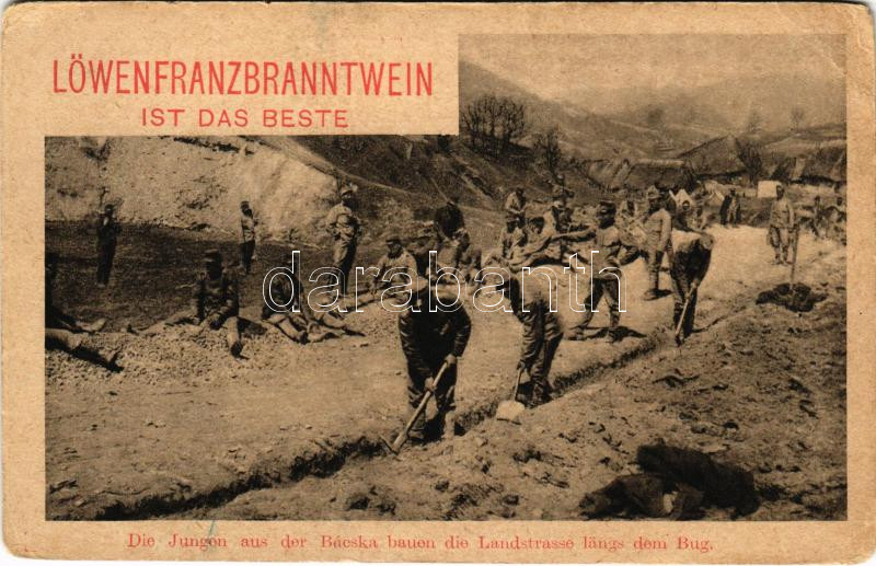 Löwen-Franzbranntwein ist das Beste. Die Jungen aus der Bácska bauen die Landstrasse längs dem Bug / German rubbing alcohol's advertisement. K.u.K soldiers from Bácska building a road / Első világháborús katonák útépítés közben. Képes Újság (EK)