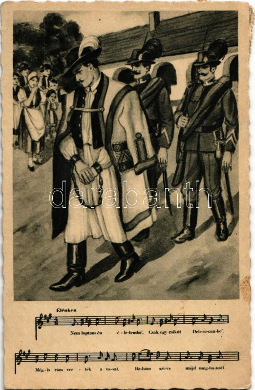 Nem loptam én életembe', csak egy csikót Debrecenbe'... magyar folklór kottás művészlap, csendőrök bilincsben elvezetett betyárral / Hungarian folklore art postcard, gendarmes, music sheet (EK)