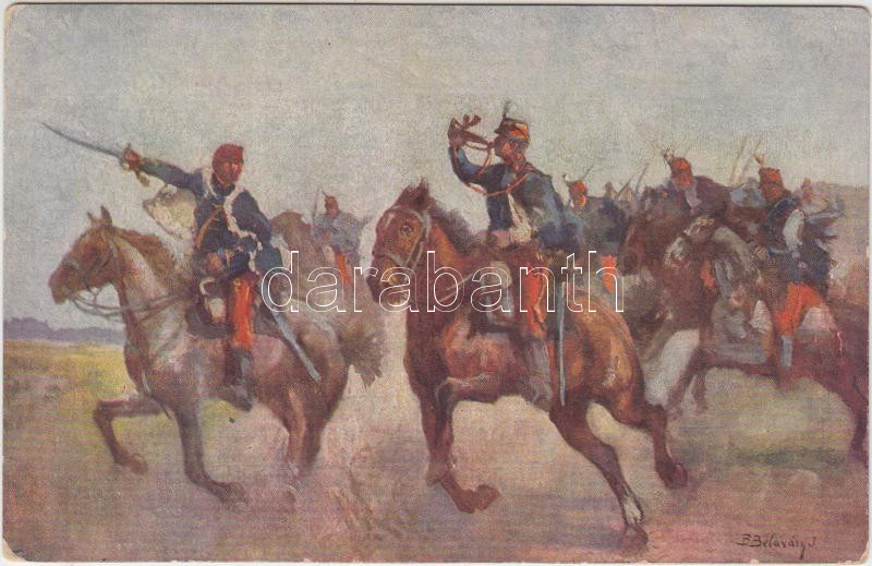 Leírás: Rohamra! Honvédelmi Minisztérium Hadsegélyező Hivatala által kiadott képeslap / Attack, WWI K.u.K. hussars, cavalry s: B. Bélaváry