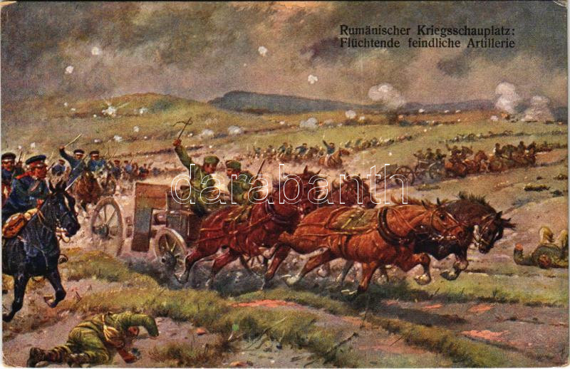 Leírás: Rumänischer Kriegsschauplatz: Flüchtende feindliche Artillerie / WWI Austro-Hungarian K.u.K. military art postcard (EK)