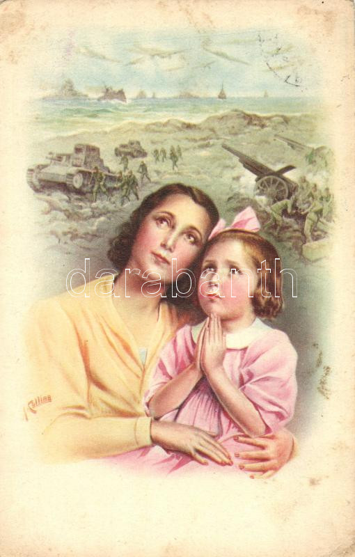 Leírás: WWII military card, cannon, tank, praying mother and daughter, artist signed (EK)