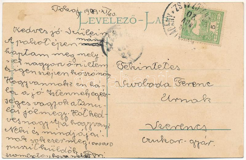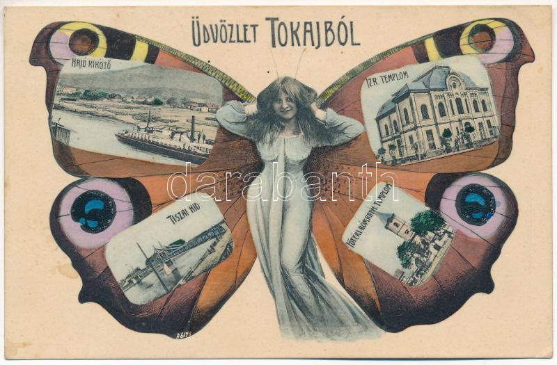 1909 Tokaj, hajó kikötő, Tiszai híd, Izraelita templom, zsinagóga, Főtéri római katolikus templom. Szecessziós pillangó hölgy montázs. Gstetner Adolf kiadása