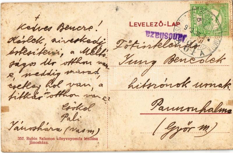 Leírás: 1913 Jánosháza, uszoda, Gróf Erdődi Sándor kastély. Rubin Salamon kiadása (fl) + "CSÁKTORNYA-DOBA-CZELLDÖMÖLK 84." vasúti mozgóposta