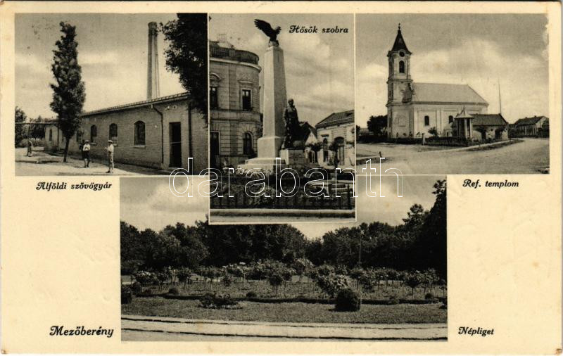 1938 Mezőberény, Alföldi szövőgyár, Hősök szobra, Református templom, ... https://www.darabanth.com/hu/457-Gyorsarveres/457.0/Kepeslapok/Magyarorszag~1000005/1938-Mezobereny-Alfoldi-szovogyar-Hosok-szobra-Reformatus-templom-Nepliget-Vitez-La~II3053942