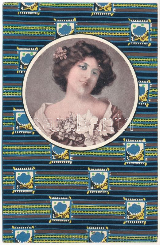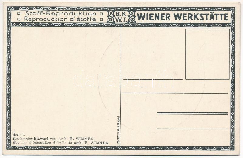 Leírás: Art Nouveau. Stoff-Reproduktion, B.K.W.I. Serie L. Wiener Werkstätte, Stoffmuster-Entwurf von Arch. E. Wimmer
