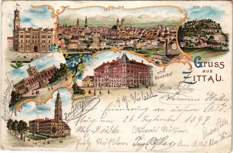 Leírás: Zittau, Rathhaus, Berg Oybin, Hotel Reichshof, Stadtbad, Johanneum. Art Nouveau, floral, litho (EK)