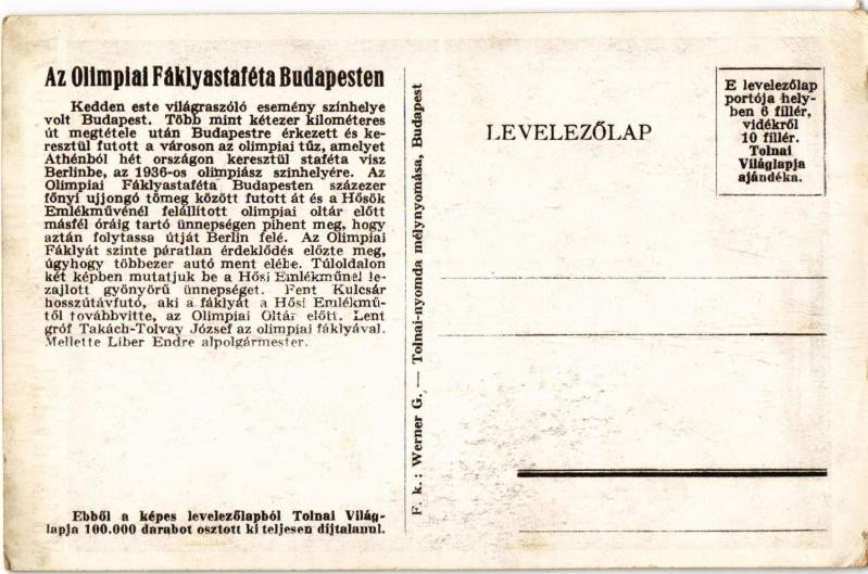 Budapest XIV. Az Olimpiai fáklyastaféta Budapesten. Az 1936-os berlini olimpia, Gróf Takách-Tolvay József és Liber Endre alpolgármester. Tolnai Világlapja 100.000 darabot osztott ki teljesen díjtalanul (EK)