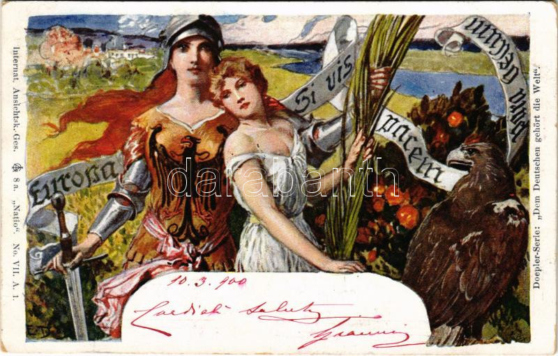 1900 Europa Si vis pacem, para bellum. Doepler-Serie: Dem Deutschen gehört die Welt. "Natio" No. VII. A. 1. / A világ a németé / The world belongs to the German. Art Nouveau propaganda