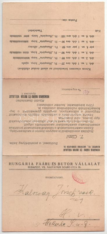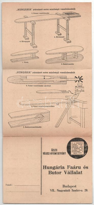 Leírás: Hungária Faáru és Bútor Vállalat 3-részes kinyitható reklám képeslapja. Budapest, Nagyatádi Szabó u. 29.