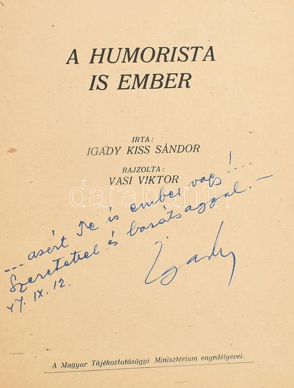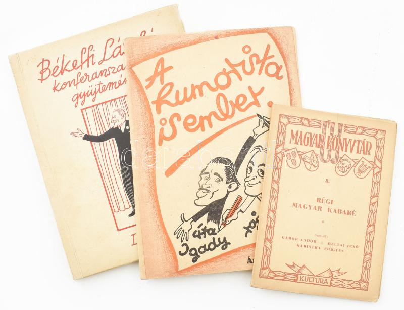3 db könyv/kiadvány (egy DEDIKÁLT): Igady Kiss Sándor - Vasi Viktor: A humorista is ember. Bp., é.n., Fodor Árpád-ny., 29+(3) p. Kiadói tűzött papírkötés. A szerző, Igady-Kiss Sándor (1920-1997) által DEDIKÁLT példány. + Békeffi László konferanszainak gyűjteménye. I. könyv. (Bp.), 1939, szerzői kiadás (Elbert és Társa-ny.), 79+(1) p. Unicus! Kiadói papírkötés, jó állapotban, a borító kissé foltos. + Gábor Andor - Heltai Jenő - Karinthy Frigyes: Régi magyar kabaré. (Haspók úr ebédel - Amerikai párbaj - Ugyanaz férfiben). Új Magyar Könyvtár 8. Bp., é.n., Kultúra (Szikra-ny.), 60+(4) p. Kiadói tűzött papírkötés, nagyrészt felvágatlan példány.