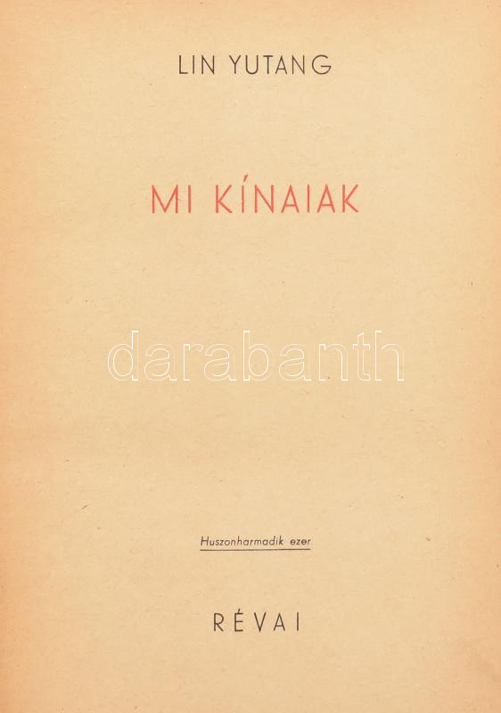 Lin Yutang: Mi kínaiak. Fordította Benedek Marcell. Bp., 1943, Révai. Huszonharmadik ezer. 371 p. Kiadói félvászon-kötés, kissé sérült gerinccel, kissé foltos borítóval.
