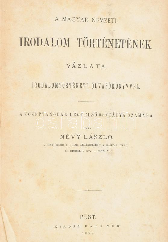 Névy László: A magyar nemzeti irodalom történetének vázlata, irodalomtörténeti olvasókönyvvel. A középtanodák legfelső osztályai számára. Pest, 1872, Ráth Mór (Athenaeum-ny.), 2 sztl. lev.+ III+(1)+400+(2) p. Első kiadás. Átkötött félvászon-kötésben, kissé sérült, kopott borítóval, helyenként kissé foltos lapokkal, ceruzás bejegyzésekkel.
