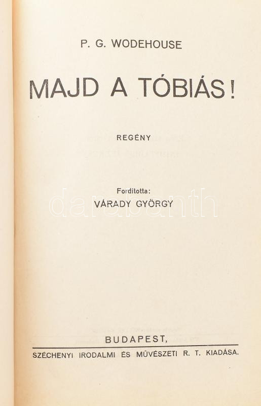 P. G. Wodehouse 2 regénye: Majd a Tóbiás! + Köszönöm, Tóbiás! Ford.: Várady György. Bp., [1941], Széchenyi Irodalmi és Művészeti Rt., 302 p.; 271 p. Első magyar nyelvű kiadás. Kiadói egészvászon-kötés, a borítón némi kopással, kis foltokkal, belül túlnyomórészt jó állapotban.