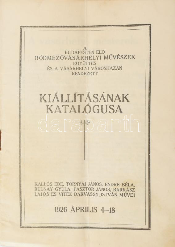 1926 A Budapesten élő hódmezővásárhelyi művészek együttes és a vásárhelyi városházán rendezett kiállításának katalógusa. (Kallós Ede, Tornyai János, Endre Béla, Rudnay Gyula, stb ) 14p. vitéz Darvassy István szervezésében