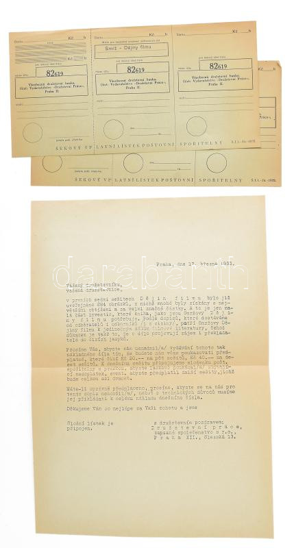 1932-1934 Karel Smrz: Déjny Filmu. Orbis Pictus 1-25. szám. Teljes! Praha,1932-1934, Druzseni Práce. Cseh nyelven. Avantgárd borítókkal. Rendkívül gazdag fekete-fehér szövegközti képanyaggal és egy kétoldalas színes táblával illusztrált. Kiadói levéllel és csekkel. Az utolsó számba (24-25.) kötötték be az 1. ívet, a címlapot. = Kifejezetten a gyűjtők számára. Kiadói papírkötés, az 1. szám borítója sérült, részben javított, néhány borító szakadt, további egy szám hátsó borítója sérült, kissé hiányos. Rendkívül ritka filmművészeti folyóirat! / Karel Smrz: Déjny Filmu. Orbis Pictus 1-25. number. Complete!. Praha,1932-1934, Druzseni Práce. In Czeh language. With avant-garde covers. With lot of black-and-white photographs and one color table. With publisher letter, and check. It bound the first sheet (the cover...) into the last issue. = Especially for collectors. Papercovers, the first number first cover, one other cover damaged, some cover torn. Very rare movie art newspaper!
