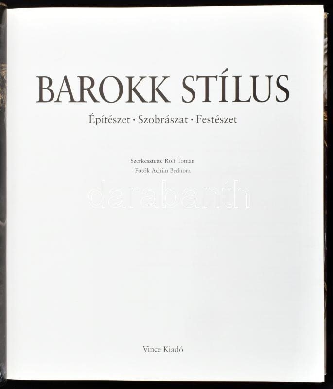 Leírás: Barokk stílus. Építészet, szobrászat, festészet. Szerk.: Rolf Toman. Achim Bednorz fotóival. Ford.: Harmathné Szilágyi ANna, Körber Ágnes. Bp., 2004, Vince. Második kiadás. Gazdag képanyaggal illusztrált. Kiadói egészvászon-kötés, kiadói papír védőborítóban.