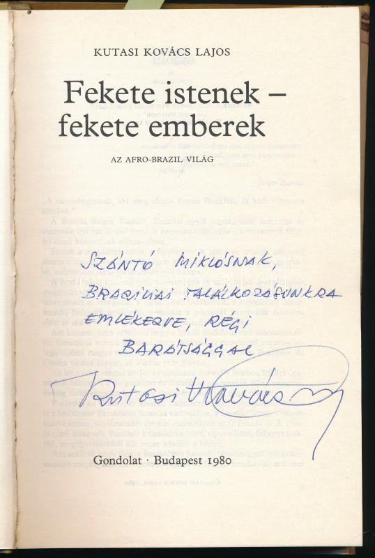 Kutasi Kovács Lajos: Fekete istenek, fekete emberek. DEDIKÁLT! Az Afro-Brazil világ. Bp., 1980. Gondolat. Kiadói egészvászon-kötés, kiadói papír védőborítóban.