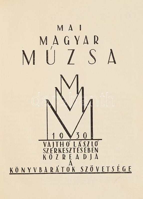 Mai magyar múzsa 1930. Szerk. Vajthó László. Bp., Könyvbarátok Szövetsége. Kiadói aranyozott félbőr kötésben, a szerzők portréival illusztrálva. Néhány lap és a hátsó borító kissé hullámos