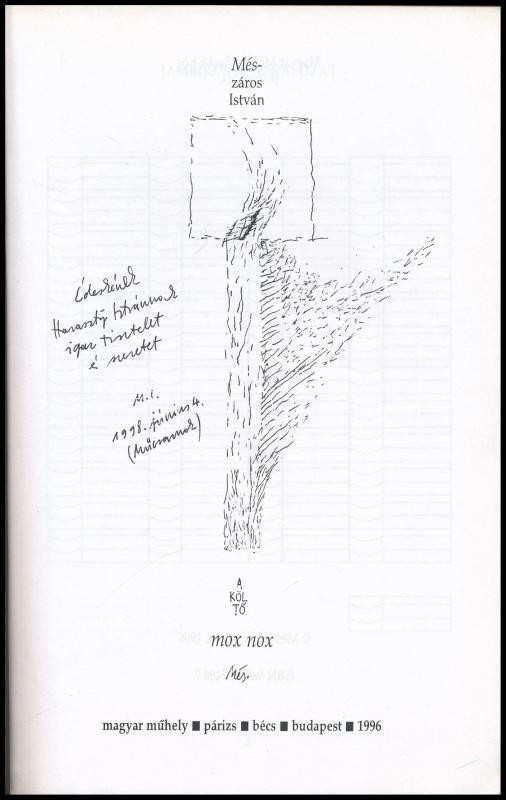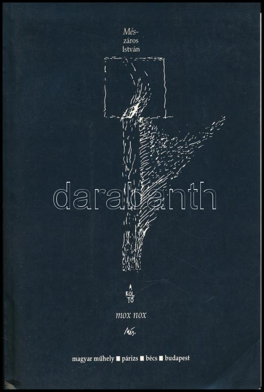 Més-záros István: Mox nox. A szerző, Més-záros (Mészáros) István (1959-) költő, festőművész által Haraszty István "Édeskének" (1934-2022), Kossuth-díjas szobrász, festőművésznek DEDIKÁLT példány. Magyar Műhely Baráti Kör Füzetek 43. Párizs - Bécs - Bp., 1996., Magyar Műhely. Kiadói papírkötés.