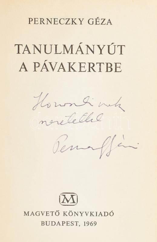 Perneczky Géza: Tanulmányút a pávakertbe. Perneczky Géza (1936-) Széchenyi-díjas magyar művészettörténész, képzőművész, festő, író által Haraszty István (1934-2022), Kossuth-díjas szobrász, festőművésznek DEDIKÁLT! Bp., 1969, Magvető. Megjelent 2100 példányban. Kiadói egészvászon kötésben, kiadói papír védőborítóval.