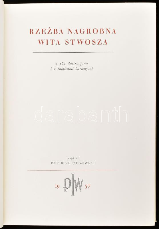 Piotr Skubiszewski: Rzeźba nagrobna Wita Stwosza. Warszawa, 1957, Wydawnictwo PIW. Egészoldalas képekkel illusztrálva. Lengyel nyelven. Kiadói egészvászon-kötés, ajándékozási bejegyzéssel, kissé sérült kiadó papír védőborítóban, kartontokban.