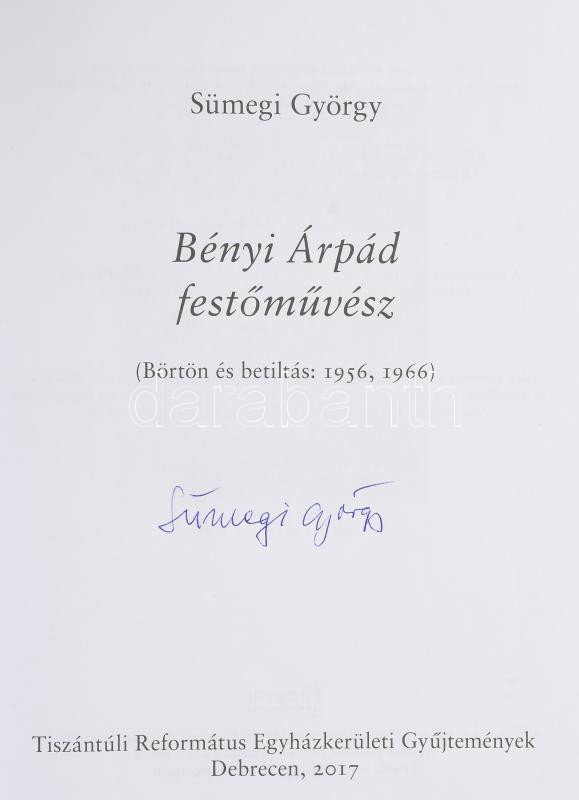 Sümegi György: Bényi Árpád festőművész. (Börtön és betiltás: 1956, 1966.). A szerző, Sümegi György (1947-) művészettörténész által ALÁÍRT! Debrecen, 2017, Tiszántúli Református Egyházkerületi Gyűjtemények. Gazdag képanyaggal, Bényi Árpád műveinek reprodukcióival illusztrált. Kiadói kartonált papírkötés.