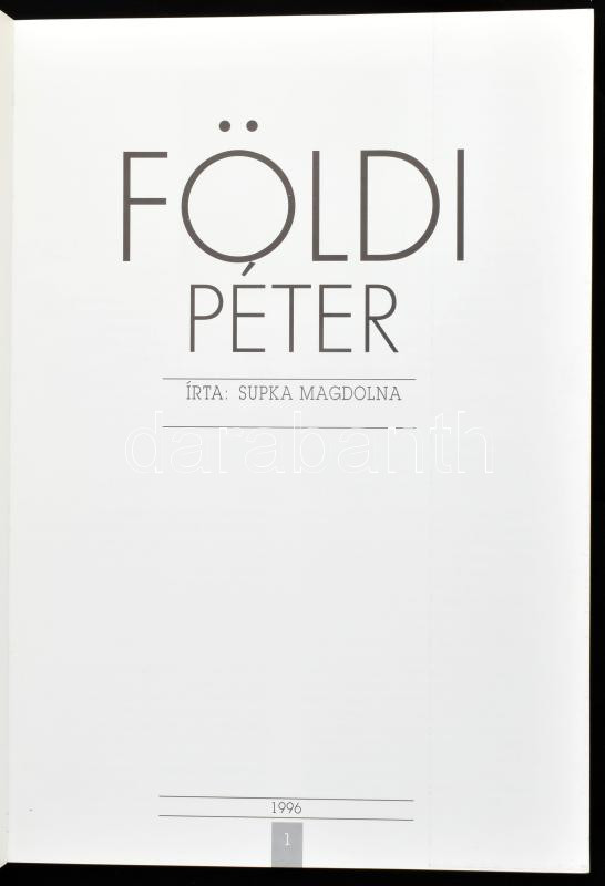 Leírás: Supka Magdolna: Földi Péter. (Művészeti katalógus). Szelényi László fotóival. Szolnok, 1996, Tisza Nyomda Kft., 52 p. Kiadói papírkötés, kiadói papír védőborítóban.