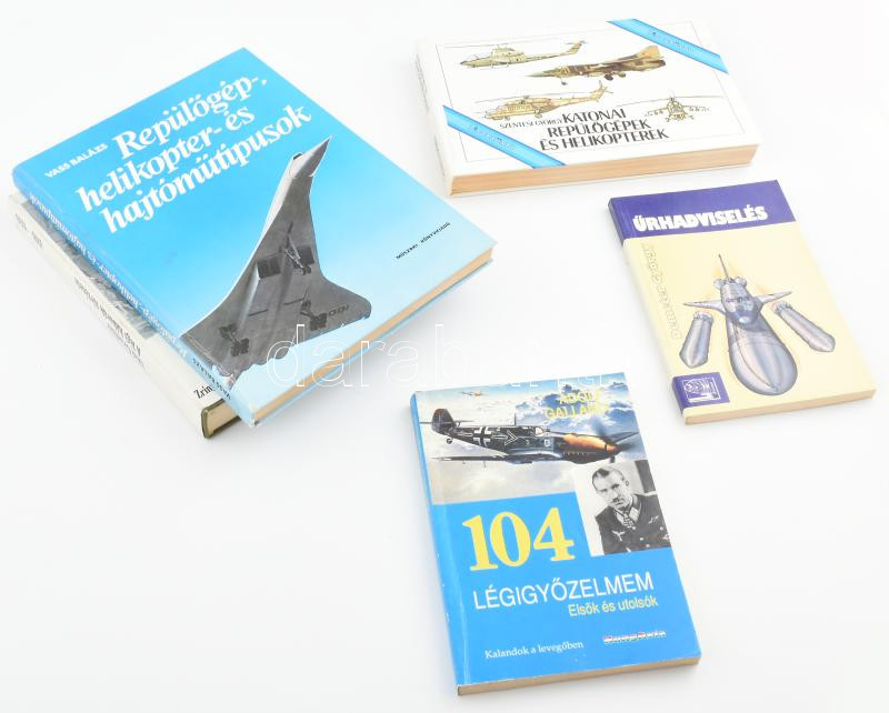 Vegyes repüléssel kapcsolatos tétel, 5 db: Adolf Galland: 104 légigyÅ‘zelem.; Demeter György: Űrhadviselés.; Szentesi György: Katonai repülÅ‘gépek és helikopterek.; Vass Balázs: RepülÅ‘gép-, helikopter- és hajtóműtÃpusok.; Olaf Groehler: A légi háborúk története. Különféle kiadásokban, különféle kötésekben, változó állapotban.;