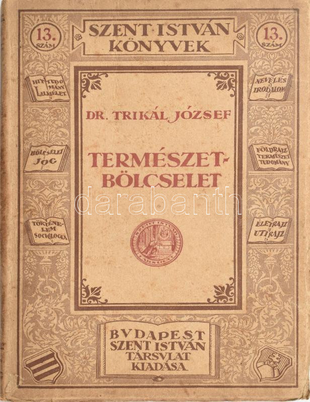 Dr. Trikál József: Természetbölcselet. Szent István Könyvek 13. sz. Bp., 1924, Szent István-Társulat, 149 p. Kiadói papírkötés, kissé foltos borítóval, egy lap szélén sérüléssel, korabeli ajándékozási bejegyzéssel.